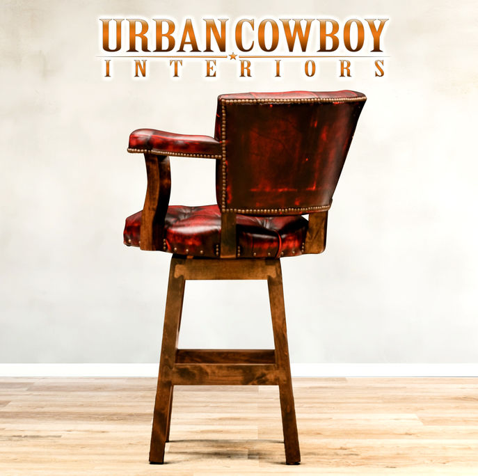 Introducing the American-made Rubi Chisum Barstool, a timeless piece of furniture that brings both style and comfort to any home. Crafted with knotty alder, this barstool is built to last for years to come. The unique hand-wipe red leather upholstery gives each piece a distinct, stained, and aged look, making every barstool truly one-of-a-kind. The RJ Chisum barstool has been a staple in the industry for over 20 years, and its design has been perfected for maximum comfort, from the ideal back pitch to the upholstered arms. Add a touch of classic Americana to your kitchen or bar area with the Rubi Chisum Barstool.